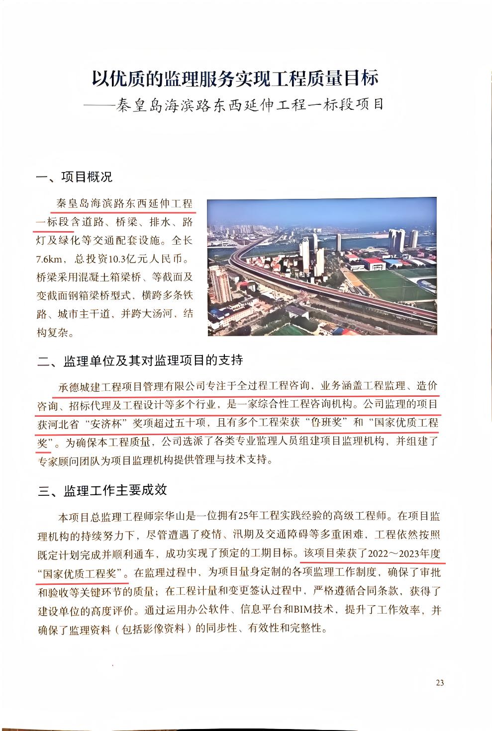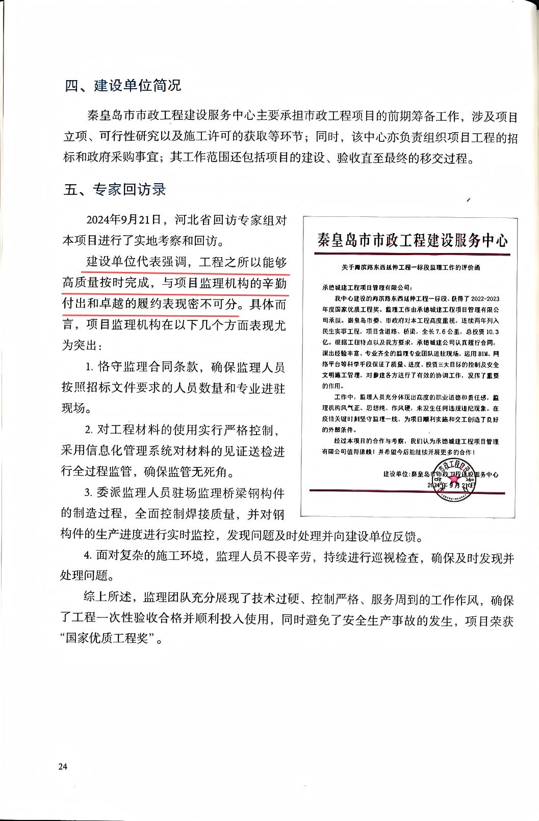 在本次入選《工程監(jiān)理業(yè)主滿意項目》百強名單的秦皇島海濱路東西延伸工程一標段項目中,承德城建展現(xiàn)了精益求精的專業(yè)實力和恪盡職守的擔當精神。作為秦皇島市的重點工程,該項目涵蓋道路、橋梁、排水、路燈及綠化等交通配套設施,采用混凝土箱梁橋、等截面及變截面鋼箱梁橋型式,結(jié)構(gòu)復雜,監(jiān)理難度大。承德城建選派優(yōu)秀總監(jiān)及各專業(yè)監(jiān)理人員組成強有力的項目監(jiān)理機構(gòu),并組建專家顧問團隊為項目提供全方位的管理與技術支持。